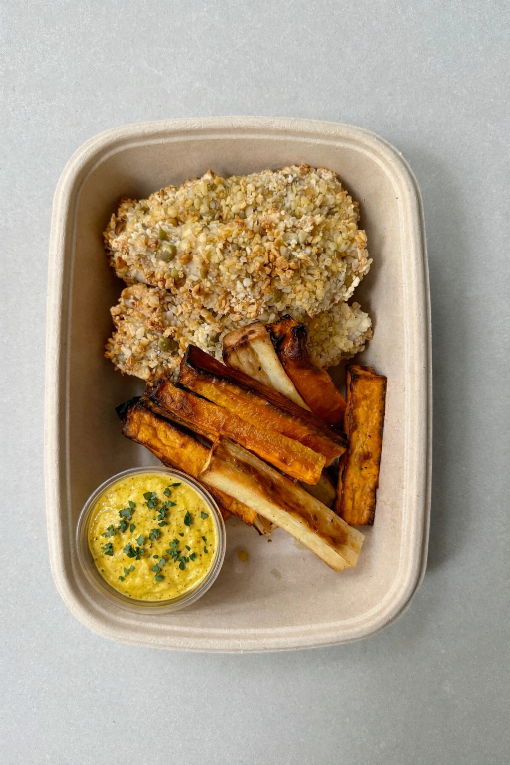 Pumpkin Seed and GF Bread Crumbs Chicken Breast with Oven Roasted Root Vegetables and Honey Mustard